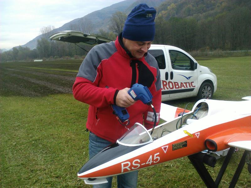 Per limitare al massimo l’ interferenza con la piazzola dell’ eli soccorso, decidiamo di centrare il box verso 3/4 in direzione E. Ah il modello è proprio bello, caspita. Mic mi spiega a “spandoni” le caratteristiche principali degli impianti radio, pneumatico, turbina e dopo 10 minuti è pronto alla partenza. Papa Alfa è su Sondalo, nessun traffico riportato. Rifornimento jetA1 e aria, accensione. Che sinfonia, accidenti. Allineamento e decollo 09. Veloce , impressionante, si arrampica su per il cielo con autorità. Gear up, e alcuni passaggi per trimmare. Proprio bello. Qualche salita in candela, tonneaux, mezzo otto cubano, passaggi bassi. Dopo 5 minuti atterraggio. gear down, flap landing. Eccolo in finale, bello, stabile, vero. Atterraggio da manuale, ottimo ottimo ottimo.